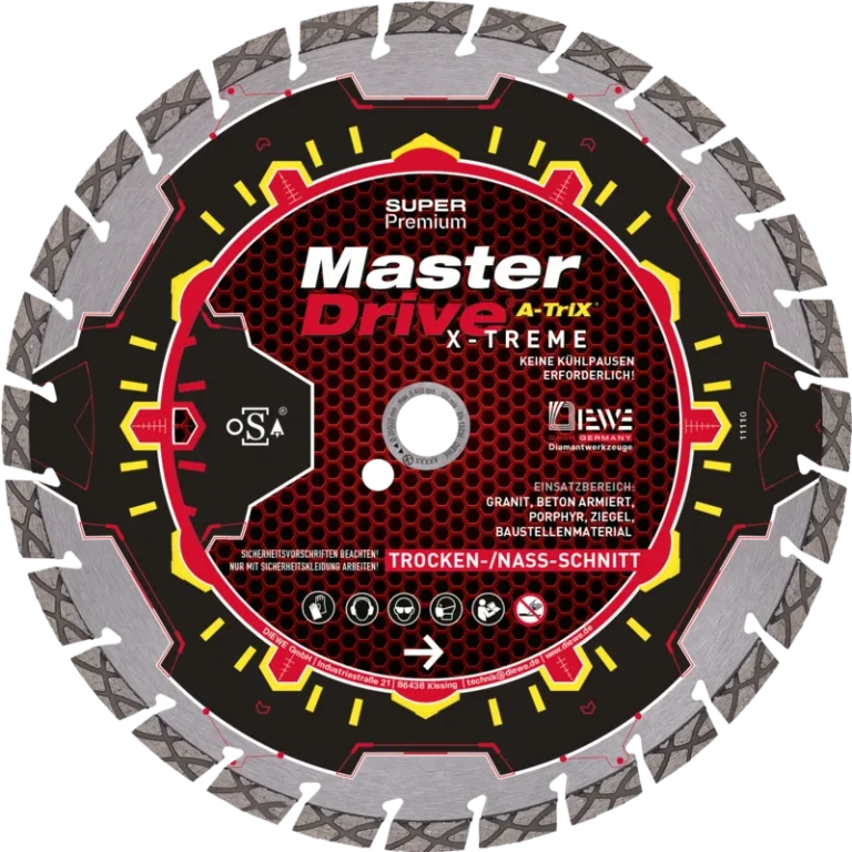 Die Master Drive X-TREME Diamanttrennscheibe mit innovativen A-Trix Segmenten und präziser Diamantanordnung bietet herausragende Schnittleistung und Langlebigkeit – selbst bei anspruchsvollen Materialien wie Granit, Natur- und Kunststein, Beton und Stahlbeton. Diese Super-Premium-Qualität überzeugt durch Schnelligkeit, Präzision und höchste Standzeit.